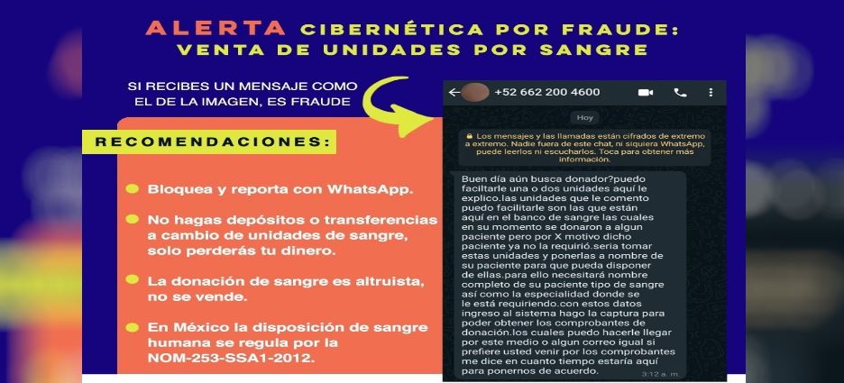 La Unidad Cibernética de la Secretaría de Seguridad Pública (SSP) de Sonora, alertó a la población por un mensaje sobre venta de unidades de sangre que circula a través de la red social de WhatsApp.